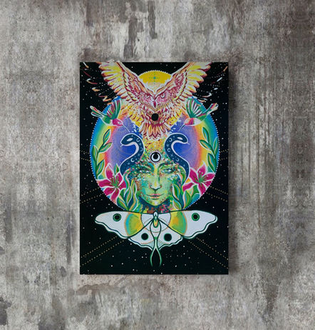 Today, she weaves mysticism, meditation, and intuitive painting into works that act as portals—inviting the viewer into remembrance of their pure essence. Each piece reflects the interconnectedness of life and the divine light that flows through all beings.